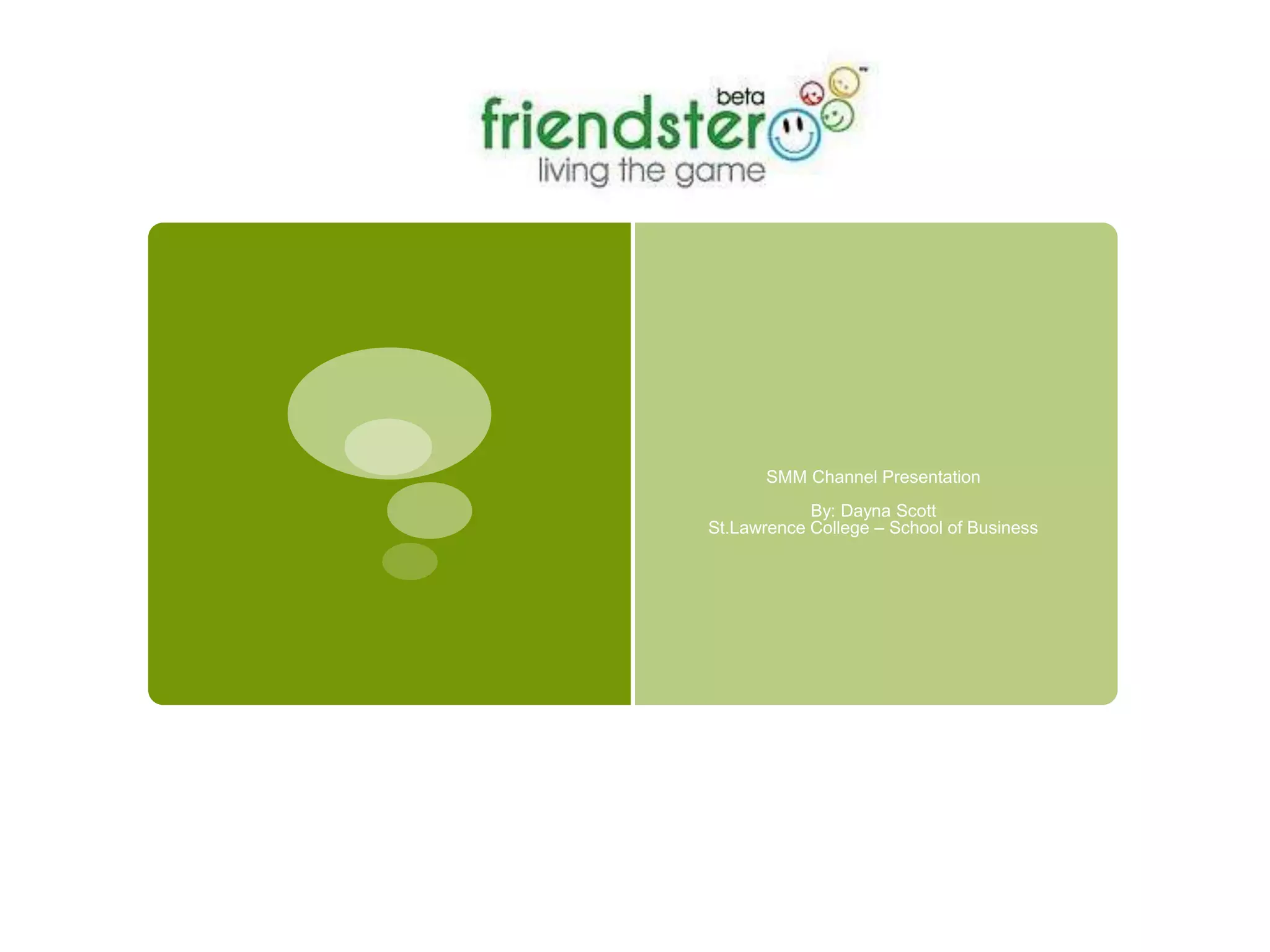 Friendster is a social gaming site created in 2002 that is most popular in Asia, with 90% of its traffic coming from Asia. It focuses on speed of innovation and adapting to the Asian market. In 2009, it launched do-it-yourself ads allowing users to create ads, choose budgets and targets. Friendster is also expanding into mobile by offering text alerts in Asia to keep up with competition. While it was originally overtaken by Myspace and Facebook, Friendster has embraced its Asian target market and offers social features like photo sharing and gaming.