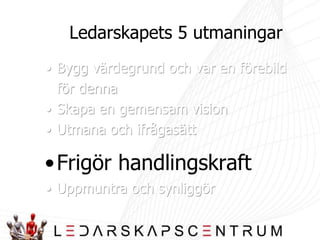 Ledarskapets 5 utmaningarByggvärdegrund och var en förebild för dennaSkapa en gemensam visionUtmana och ifrågasättFrigör handlingskraftUppmuntra och synliggör