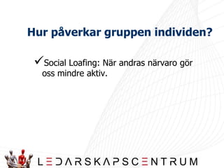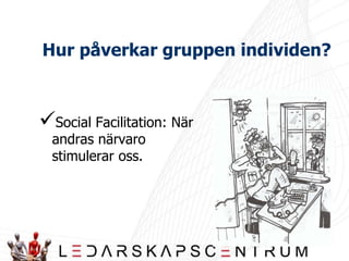 Hur påverkar gruppenindividen?Social Facilitation: När andras närvaro stimulerar oss.Hur påverkar gruppen individen?Social Loafing: När andras närvaro gör oss mindre aktiv.Hur påverkar gruppen individen?Studie av dragkampIndividuellt 85kgGrupp 64kg