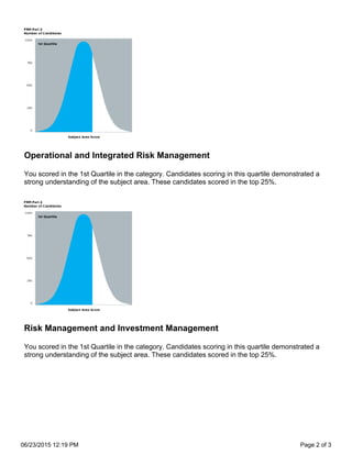 Matteo Massardi scored in the top 25% in all categories of the FRM Exam Part II, placing in the first quartile for Market Risk Measurement and Management, Credit Risk Measurement and Management, Operational and Integrated Risk Management, Risk Management and Investment Management, and Current Issues in Financial Markets. This demonstrates a strong understanding of all subject areas tested.