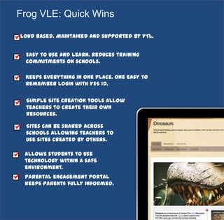 Frog VLE is a cloud-based learning platform that allows schools to create online sites and resources for teaching and learning. It offers various tools to facilitate communication and collaboration between teachers, students, and parents. These include classroom sites for sharing content, forums for discussion, and a parental portal to keep parents informed. Frog VLE aims to modernize education through its easy-to-use digital tools and centralized online environment.