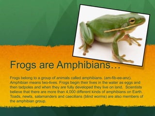 The document provides an overview of frogs, highlighting their classification as amphibians and their life cycle, which begins in water as eggs and tadpoles before transitioning to land. It describes the characteristics of frogs, including their carnivorous diet, unique tongues, and adaptations for jumping and swimming, along with the various threats they face, particularly from human activities and environmental changes. Additionally, the document emphasizes the declining populations of frogs, particularly in New Zealand, where certain species are critically endangered.