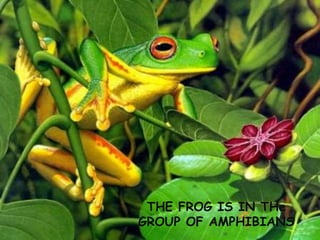 Frogs belong to the amphibian group and lay their eggs in water, where baby frogs live and grow while breathing through gills. Adults frogs breathe through lungs and skin and eat small animals like mice and worms, using webbed feet to swim and strong back legs to jump. The poison dart frog is particularly beautiful with a long, sticky tongue.