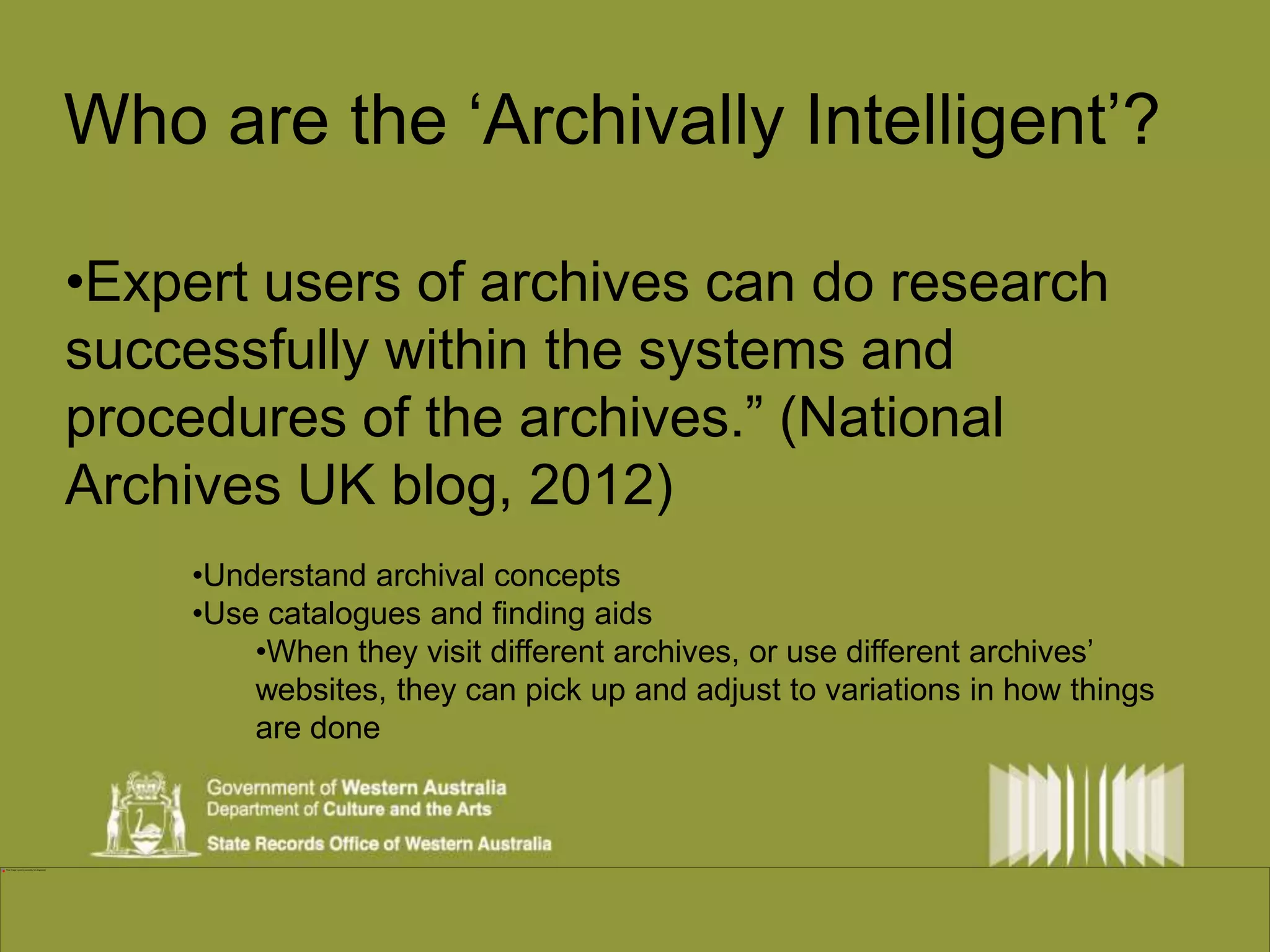 The document discusses the concept of 'archivally intelligent' users who can effectively navigate and utilize archival systems and descriptions. It highlights the functionalities of archival catalogues such as Aeon and Atom, focusing on their search capabilities and the structured organization of archival records. Additionally, it mentions upcoming changes to the State Records Office's systems and the importance of retaining standard reference formats for accessing archival items.