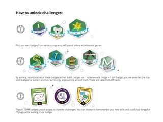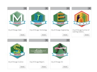 This document discusses the growing use of alternative credentials like badges in postsecondary education. It notes that student populations are expecting more flexible, relevant education and that expectations of accountability have increased. New opportunities have emerged from these changing expectations, including evaluating credit for various types of learning, alternative credentials that recognize competencies, and badges that provide evidence of skills. The document outlines the stakeholders in the open badges ecosystem like learners, learning providers, employers, and standards organizations. It also provides examples of badge initiatives in Chicago, Baltimore, Grand Rapids, and New Orleans that are gaining more traction.