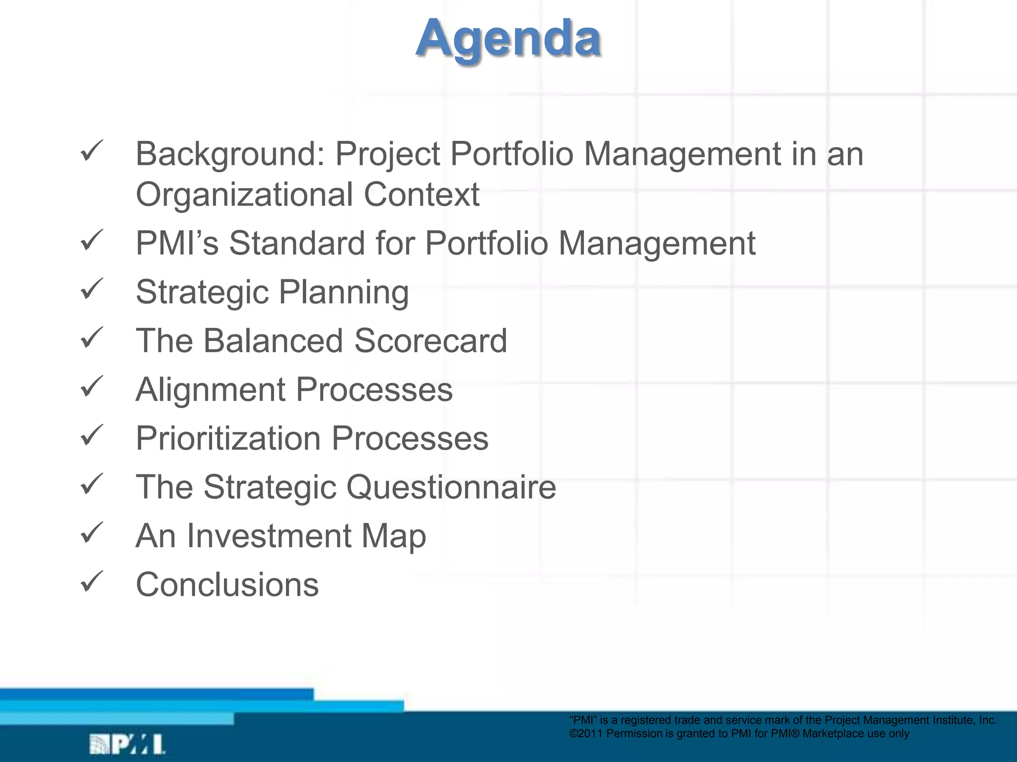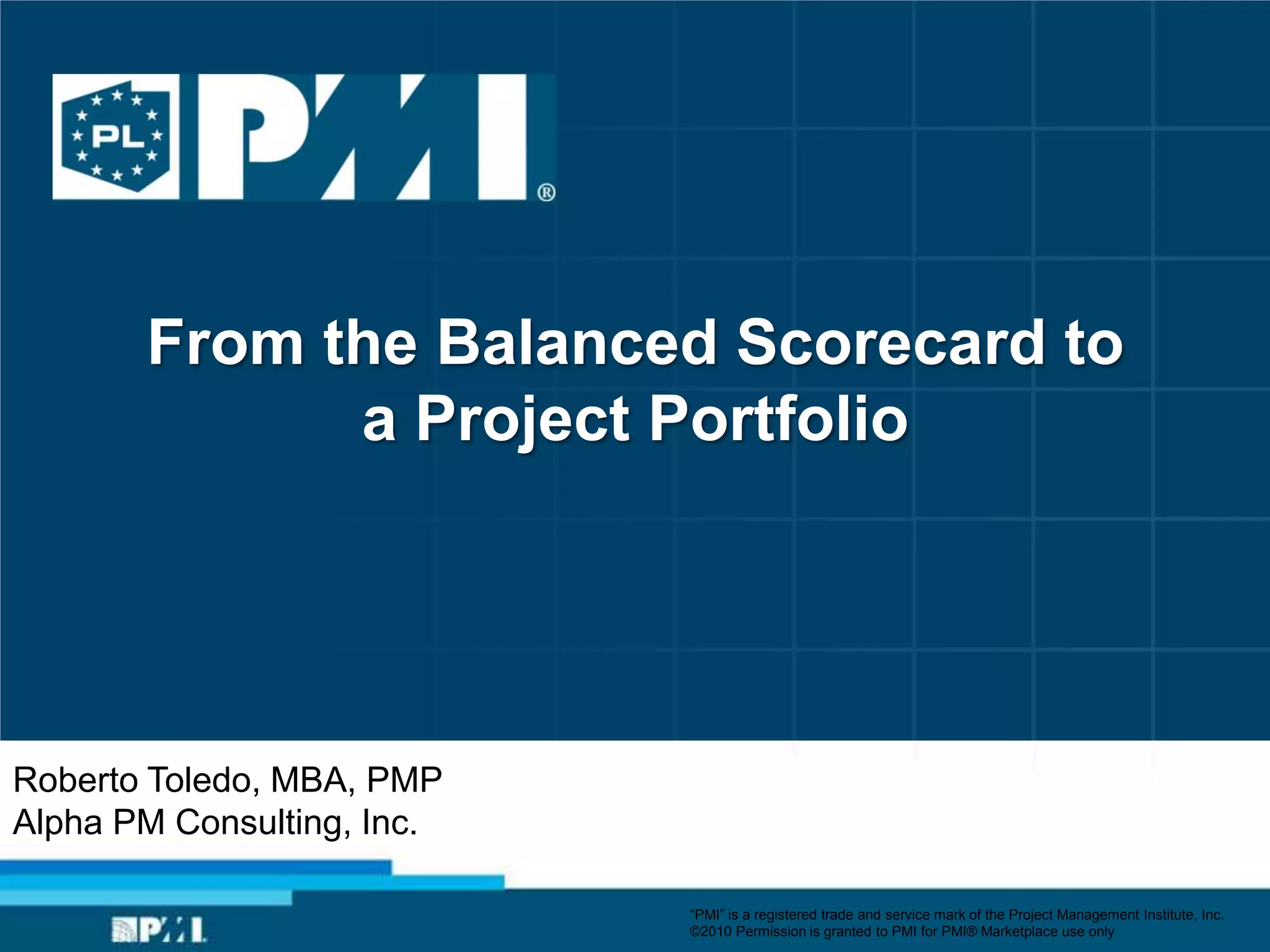 The document discusses project portfolio management and alignment with organizational strategy. It introduces the Balanced Scorecard as a tool to help with strategic planning and implementation. The Balanced Scorecard provides a framework to classify objectives across four perspectives: financial, customer, internal processes, and learning and growth. It can then be used to identify projects and initiatives that will help achieve strategic goals.