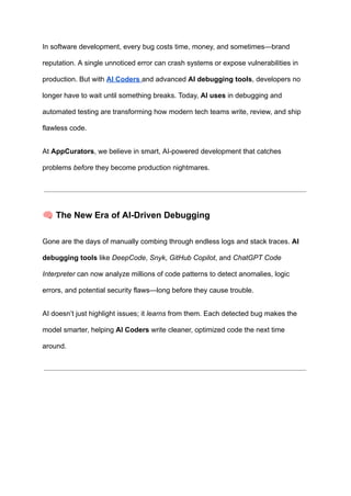 Explore how AI-powered debugging and automated testing help developers detect and fix errors before they hit production. Learn how AI Coders, predictive analytics, and smart QA tools are transforming modern development workflows at AppCurators.