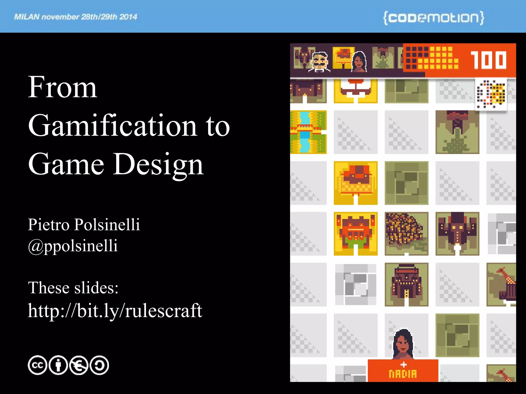 The document discusses the design of games for social impact, particularly focusing on creating e-learning tools to address issues of neglect and abuse among young people in Europe. It covers key design principles, such as the importance of simplicity, community engagement, and storytelling in game mechanics. Additionally, it touches on the distinctions between applied games and traditional games, emphasizing their purpose beyond entertainment.