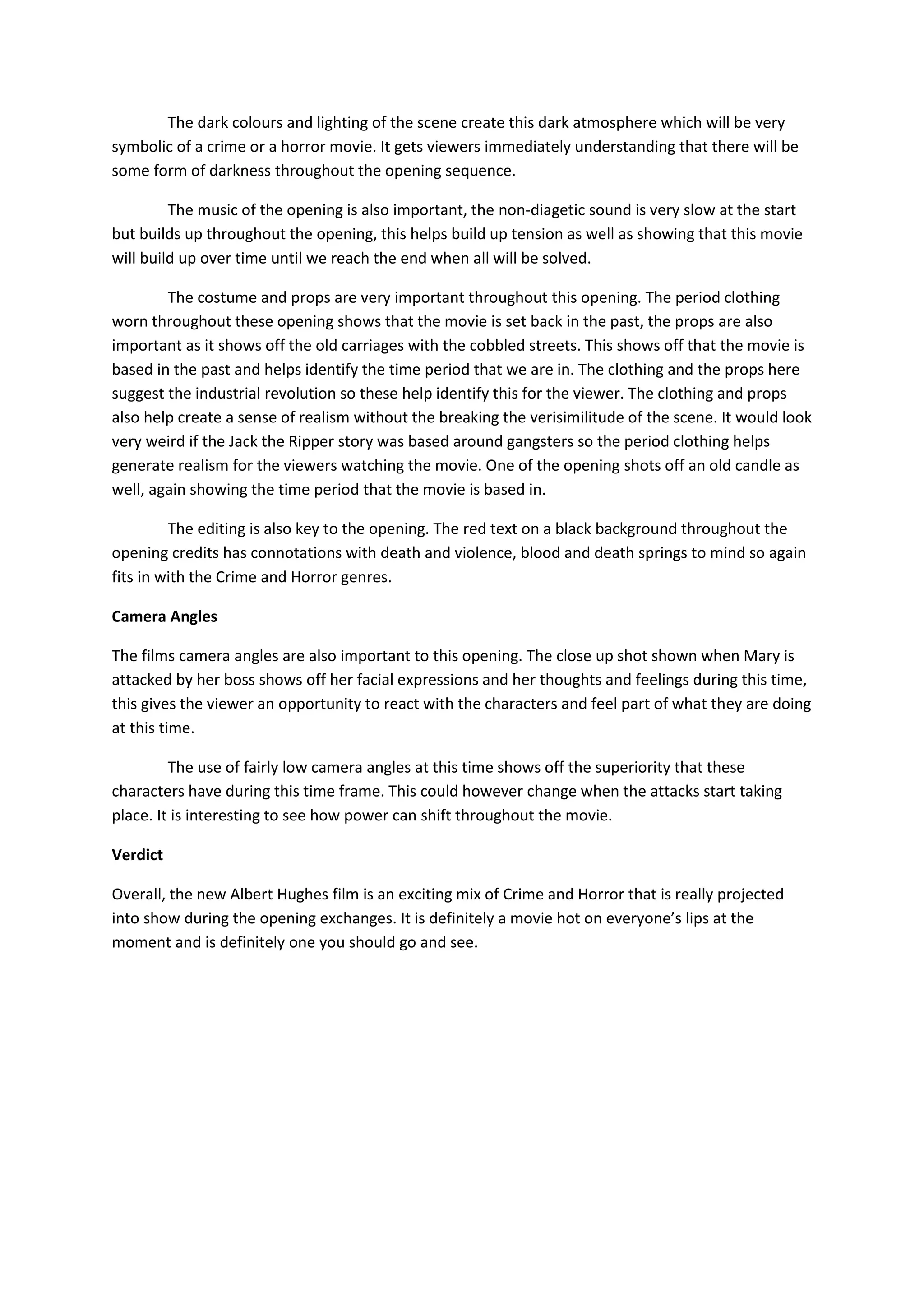 The opening sequence of the film From Hell establishes the time period and setting of late 19th century London during the industrial revolution. Dark cinematography, costumes, and a ominous musical score set a dark and foreboding tone for a film about the Jack the Ripper murders. The sequence introduces the main character smoking alone on a street corner, hinting he may be the murderer, and also shows prostitutes by a run down pub on the outskirts of the city, establishing the social circumstances of the time.