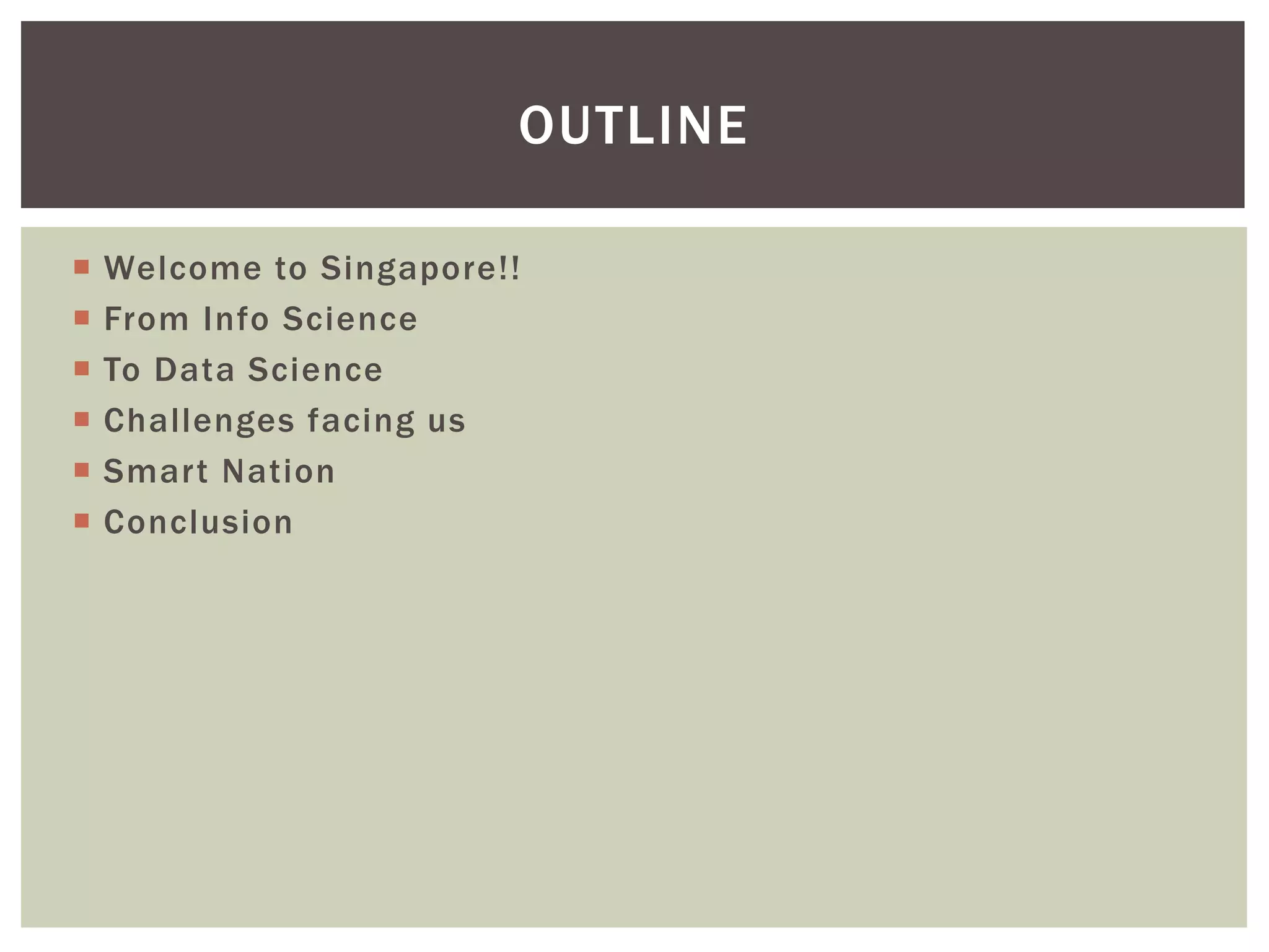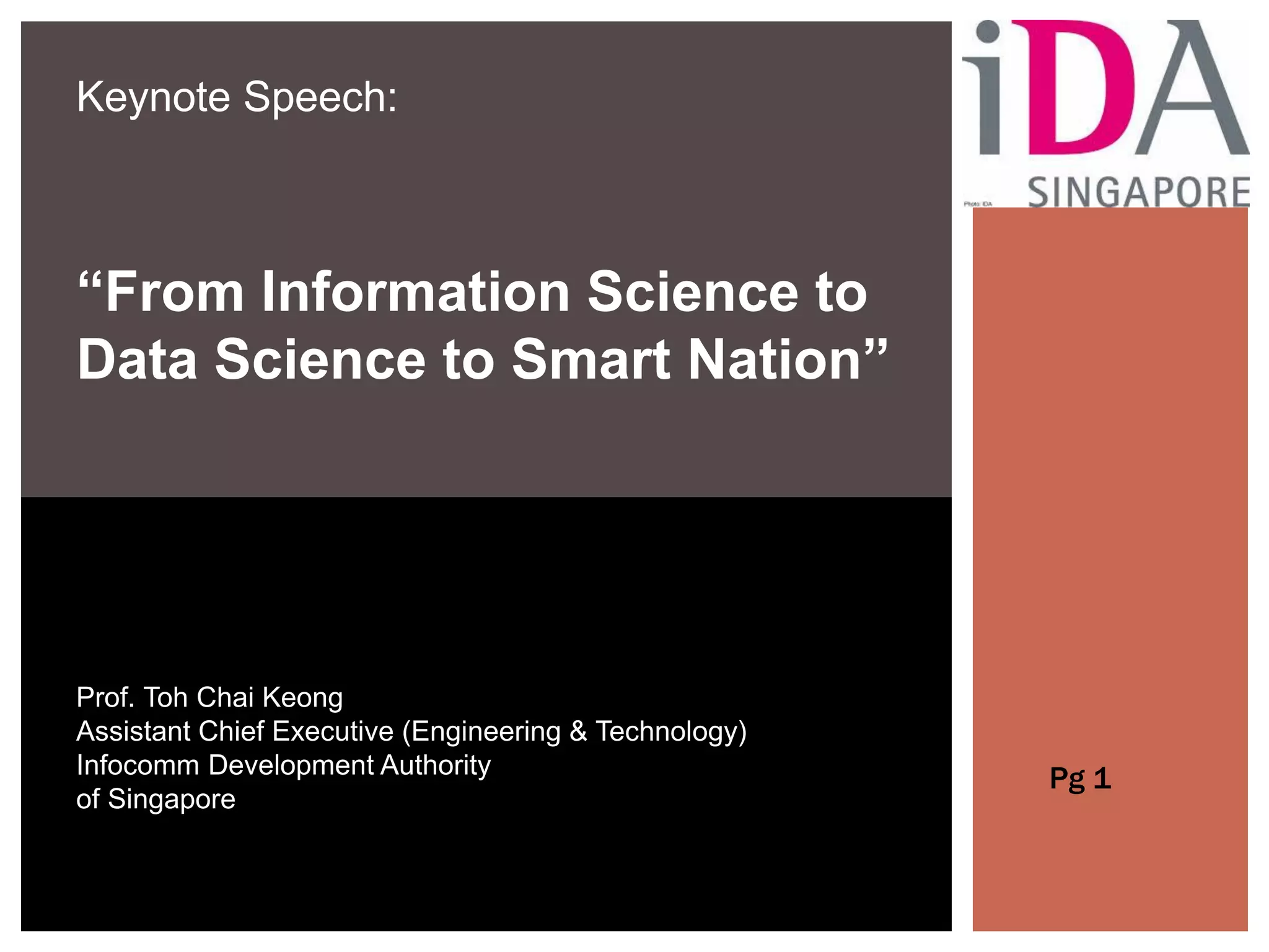 The keynote speech discusses the evolution from information science to data science and how this progression enables Singapore's vision of becoming a smart nation. It outlines how exponential growth in data and new technologies led to the birth of data science. Data science faces challenges regarding data size, computation limits, and ensuring privacy. The speech envisions how data analytics can help address Singapore's challenges like aging population and urban density through transformations in healthcare, transport, living and business enabled by a national smart nation platform.