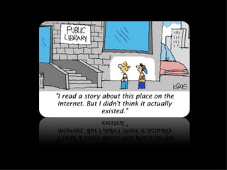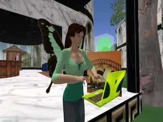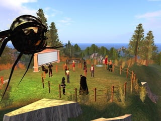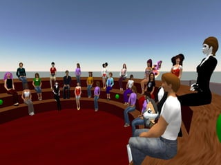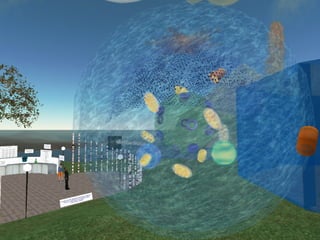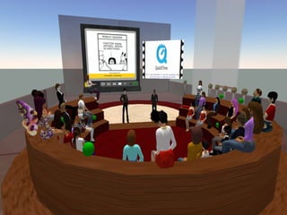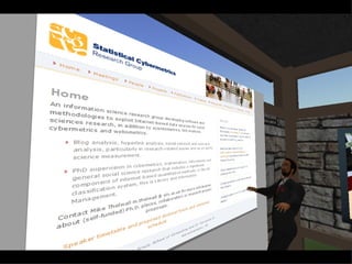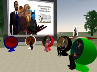 The document discusses the evolution of libraries from Library 1.0 to Library 2.0 and perspectives on virtual libraries in the future, termed Library 3D. It provides examples of libraries with presences in Second Life and summarizes preliminary research results from a survey of 19 librarians with Second Life experience. Key activities for libraries in Second Life included volunteering, exhibits, events, and classes. Challenges included hardware requirements, firewalls, and learning curves, but opportunities for research, teaching, and collaboration were seen as important to explore.