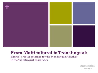 The document describes two sample lesson plans for a translingual English classroom that incorporate students' native languages. The first lesson involves students building an animal word wall in their native languages to understand cultural meanings before reading Animal Farm. The second lesson arranges an online discussion in Tamil for a student reading To Kill a Mockingbird to discuss themes and symbolism with a peer in their shared native language. Both lessons aim to value students' linguistic backgrounds to enhance understanding of English texts.