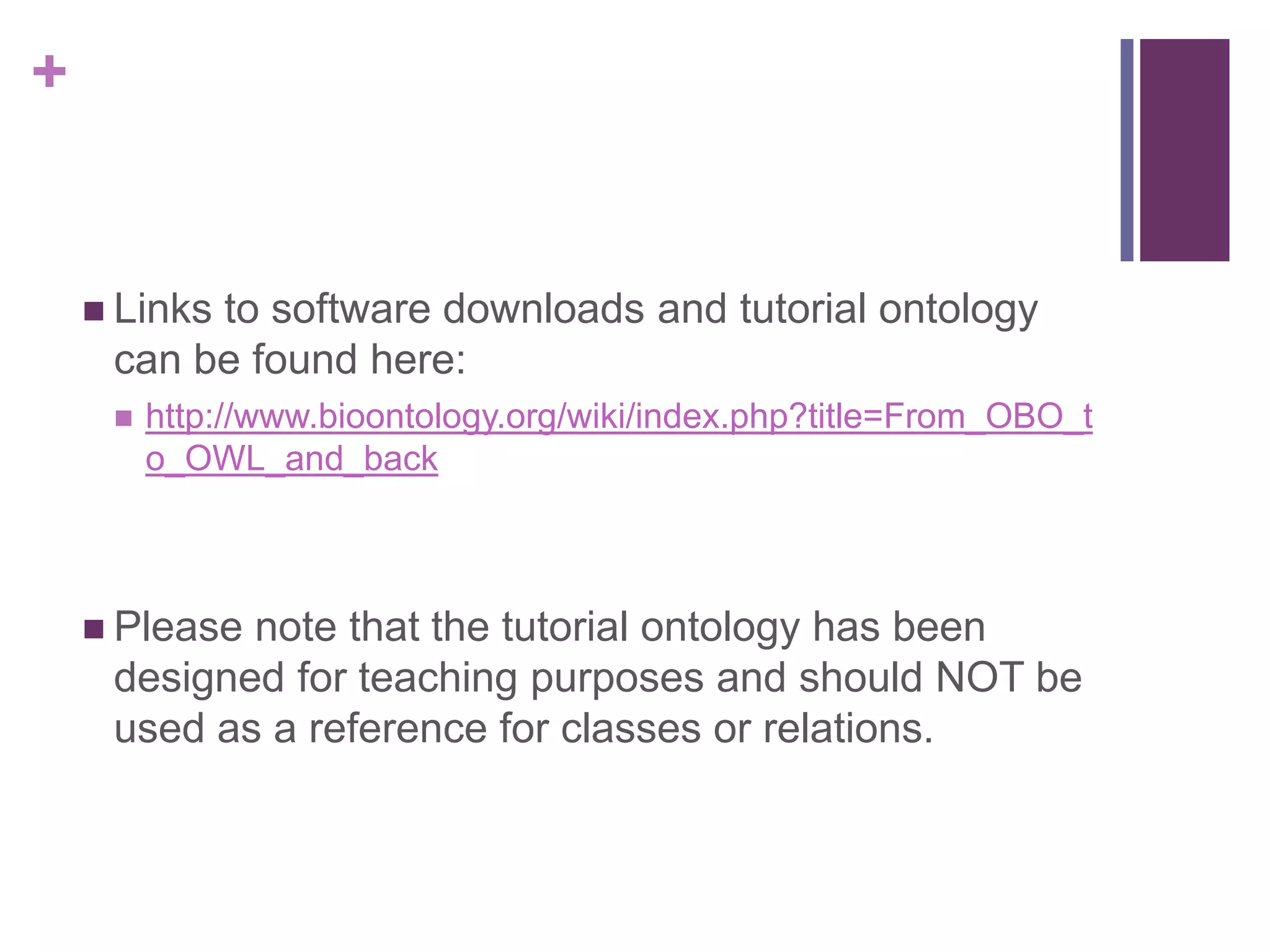 This document provides an introduction to converting ontologies between the OBO format and the OWL format. It discusses the benefits of using OWL, including taking advantage of reasoning and automated classification. It also introduces Oort, a tool for generating OBO files that do not require reasoning from ontologies that do. The document then provides a tutorial on building ontologies, including maintaining multiple classification schemes, using relationships to specify necessary and sufficient conditions for class membership, and using error messages to identify issues.