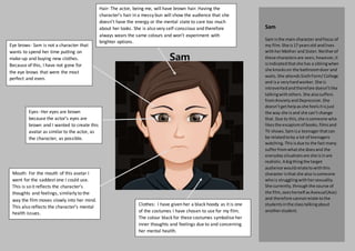 Sam is the main character of the film. She is a 17-year-old high school student who lives with her mother and sister. She suffers from anxiety and depression but does not get help because she feels it is just how she is. She finds escapism in books, films, and TV shows. Many teenagers can relate to Sam and her struggles with her sexuality as she sees herself as asexual. Her avatar has brown hair in a messy bun to show she does not care about her looks, and she wears black clothes to symbolize her inner mental state. The other students' avatars have brighter colors to contrast with Sam and show the difference between her and her peers. Diversity in skin tones among the avatars