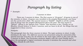 The paragraph lists three main sources in Islam - the Quran, Hadith, and Ijtihad. The Quran contains the direct words of God that were revealed to the Prophet Muhammad. The Hadith contains the words and deeds of the Prophet. Ijtihad refers to the opinions of Islamic scholars that have become law. The conclusion states that Muslims should believe in and follow the teachings of these three sources.
