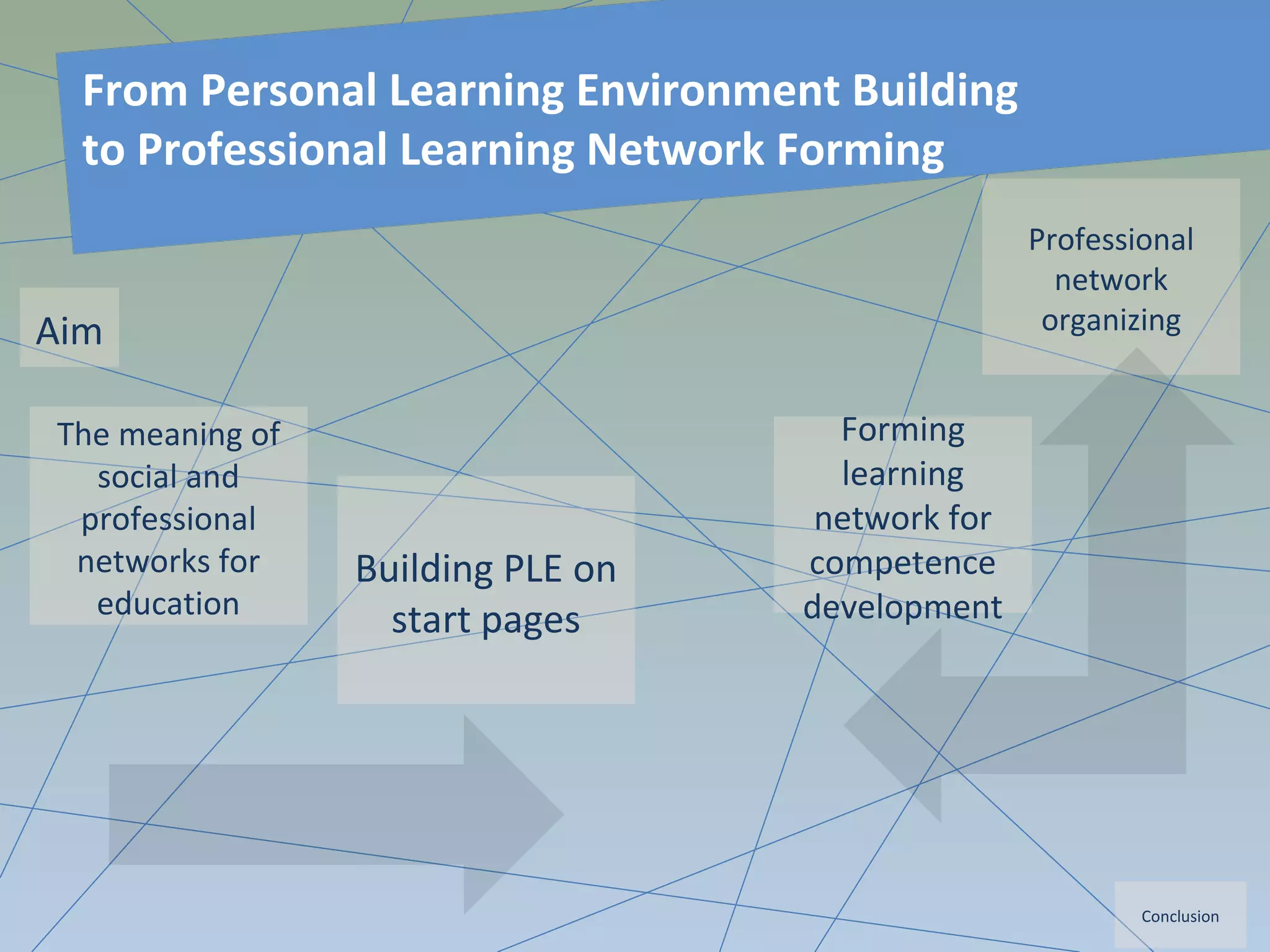 The document discusses how personal learning environments (PLEs) can help form professional learning networks (PLNs) and transition learners from managing their own learning to collaborating in professional communities. It describes how PLEs allow learners to organize resources and connect with others, laying the foundation for PLNs. Learners then expand their PLEs into PLNs and eventually professional learning networks (PfLNs) focused on their specific interests and fields. Social networks and start pages that facilitate mashing up information are presented as tools that support this process of developing independently managed learning into networked professional development and knowledge sharing.