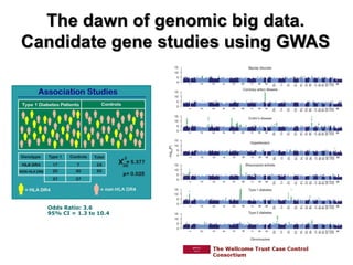 The document discusses advances in genomic research, particularly focusing on the use of genome-wide association studies (GWAS) to identify genetic variants associated with diseases. It emphasizes the complexities of interpreting genetic data, such as the missing heritability issue and the modular nature of genetic diseases, which suggests that phenotypically similar diseases may be caused by related genes. The document also highlights the importance of integrating functional biology approaches and large data sets in gene discovery and understanding disease mechanisms.
