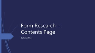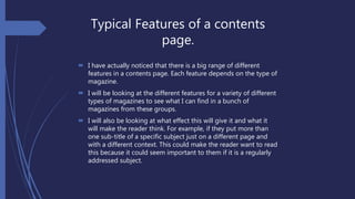 This document discusses the typical features found in the contents pages of different types of magazines, including pop, punk, rap, and rock magazines. It notes that pop magazine contents pages tend to be colorful with bright fonts, while punk magazines usually have darker color schemes. Rap magazine contents pages are generally plain with occasional bold colors and pictures of artists. Rock magazine contents pages typically feature a main artist image and use simple fonts and formatting for the contents listing. The document examines these features to understand how magazine designers provide visual appeal and emphasis to attract and guide readers.