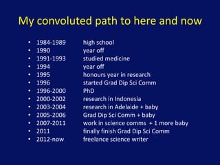 This document summarizes Sarah Keenihan's unconventional career path from studying medicine and research to becoming a freelance science writer. It outlines her education history from high school through completing a graduate diploma in science communication. The document then discusses the challenges of being a science communicator, including identifying audiences, choosing publication platforms, using appropriate language and images, and determining what subject matter and personal details to share while maintaining her identity as a scientist and person.