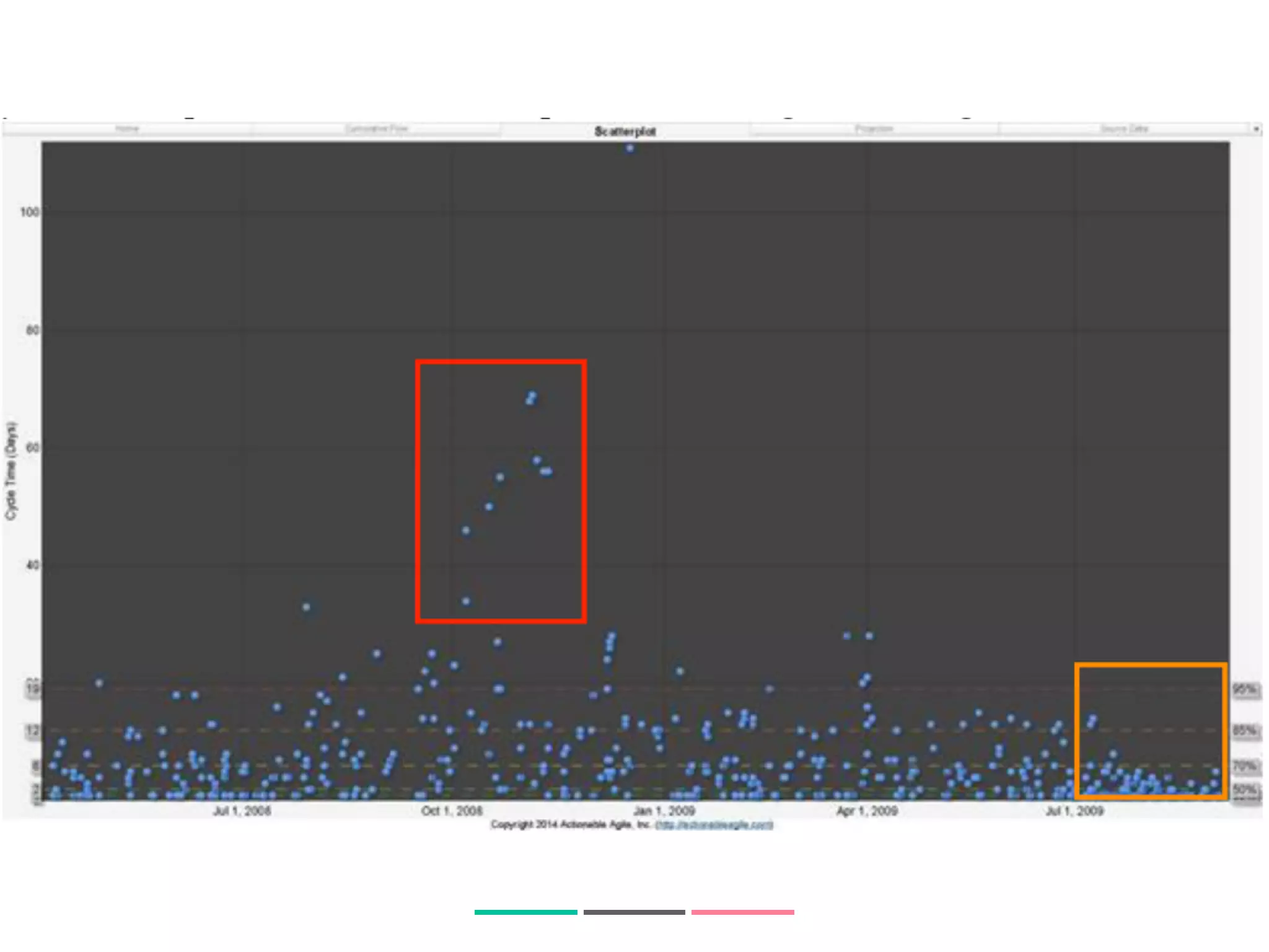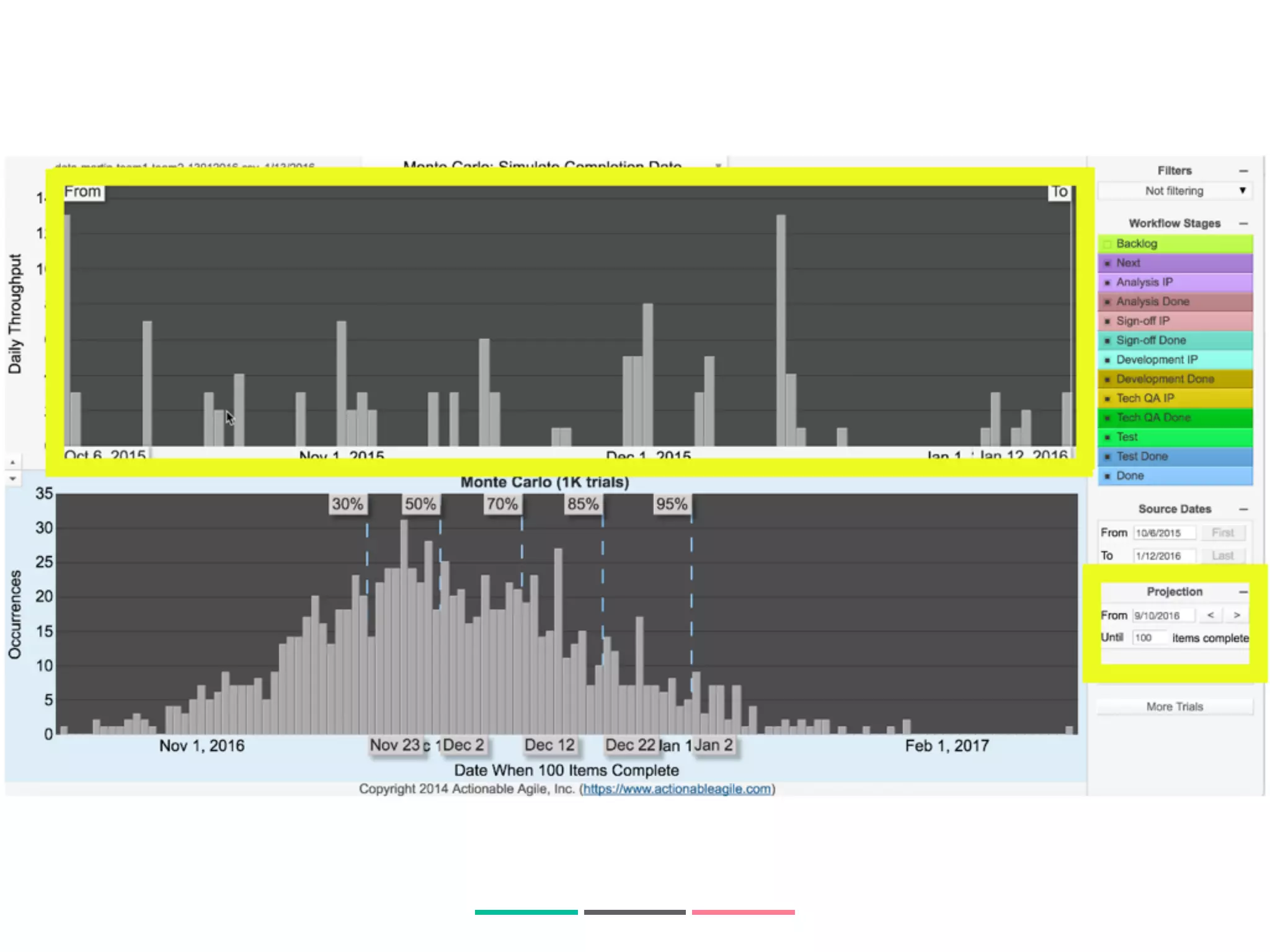 The document outlines a methodology for transitioning from Scrum to a flow-based system using actionable metrics in agile projects, emphasizing key practices like defining a Kanban system, measuring cycle time, and visualizing data. It discusses several assumptions and policies necessary to maintain process predictability and foster an effective workflow. Additionally, it illustrates the application of Monte Carlo simulations for forecasting project timelines based on various inputs.