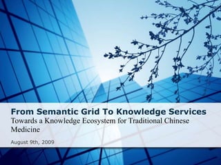 This document discusses moving towards a knowledge ecosystem for traditional Chinese medicine (TCM) by developing various semantic web and knowledge services tools. It outlines projects that have been done over 5 years to develop an integrative ontology connecting TCM and biomedical data, knowledge discovery applications, and knowledge services like a TCM encyclopedia and semantic search portal. The goal is to establish a TCM knowledge ecosystem by turning TCM assets into preserved, interpreted, and utilized knowledge through a network-based approach and various semantic and knowledge technologies.