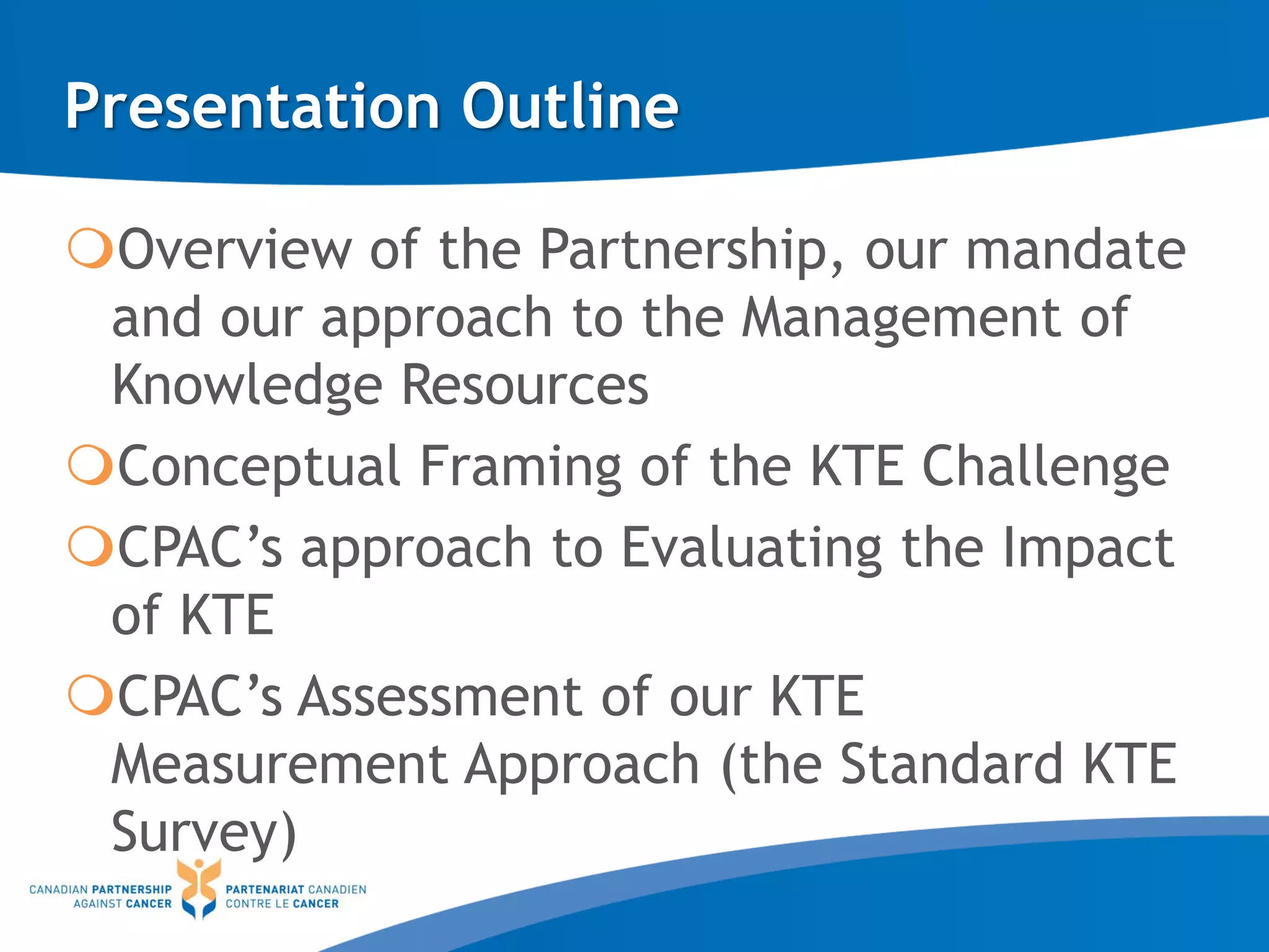 This document provides an outline for a presentation on evaluating knowledge translation and exchange (KTE). It discusses CPAC's approach to KTE, including conceptual frameworks used and evaluation of their standard KTE survey. The presentation covers defining KTE, common evaluation elements, frameworks to guide KTE design and outcomes. It also analyzes data from the KTE survey to assess usefulness and intent to use information provided. The goal is to evaluate if KTE activities enhance access to resources and motivate evidence use, and ensure the survey questions accurately measure achievement of desired KTE objectives.