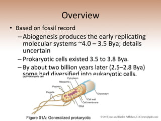 This document provides an overview of the evolution of life from single-celled organisms to complex kingdoms. It describes how prokaryotic cells existed 3.5-3.8 billion years ago and later diversified into eukaryotic cells around 2.5-2.8 billion years ago. It also discusses the early kingdoms proposed by scientists such as Aristotle, Linnaeus, and Whittaker, culminating in the three domain system of Bacteria, Archaea, and Eukarya proposed by Carl Woese.
