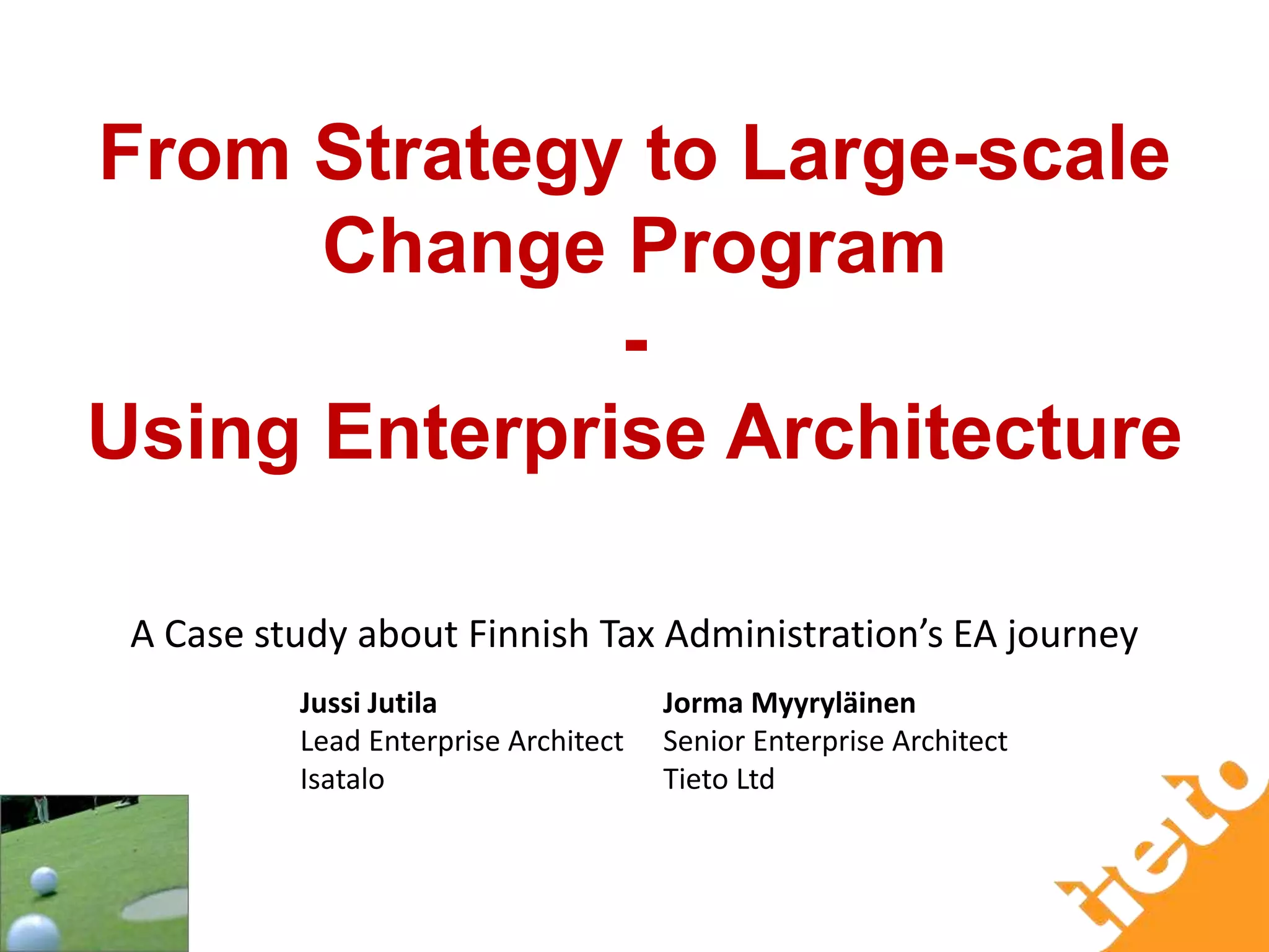 The document outlines the Finnish Tax Administration's enterprise architecture (EA) journey, highlighting the importance of leadership engagement and communication in implementing large-scale change. It details the initial challenges faced, such as outdated systems and siloed processes, and describes the development of a tailored EA framework to guide strategic transformations. The initiative has led to the successful approval of a 'to-be' state architecture and the commencement of a change program aimed at modernizing taxation functionalities.