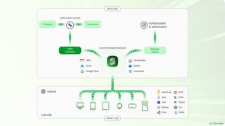 The document discusses the challenges and solutions in last-mile data streaming for real-time applications, particularly focusing on the integration of Confluent and Lightstreamer technologies. It outlines various technical solutions for enhancing data delivery and scalability, including the use of intelligent proxies and WebSocket-based protocols. Additionally, case studies highlight practical applications in industries like finance, aerospace, and media, showcasing Lightstreamer's capabilities in managing high-concurrency interactions and real-time data streaming.