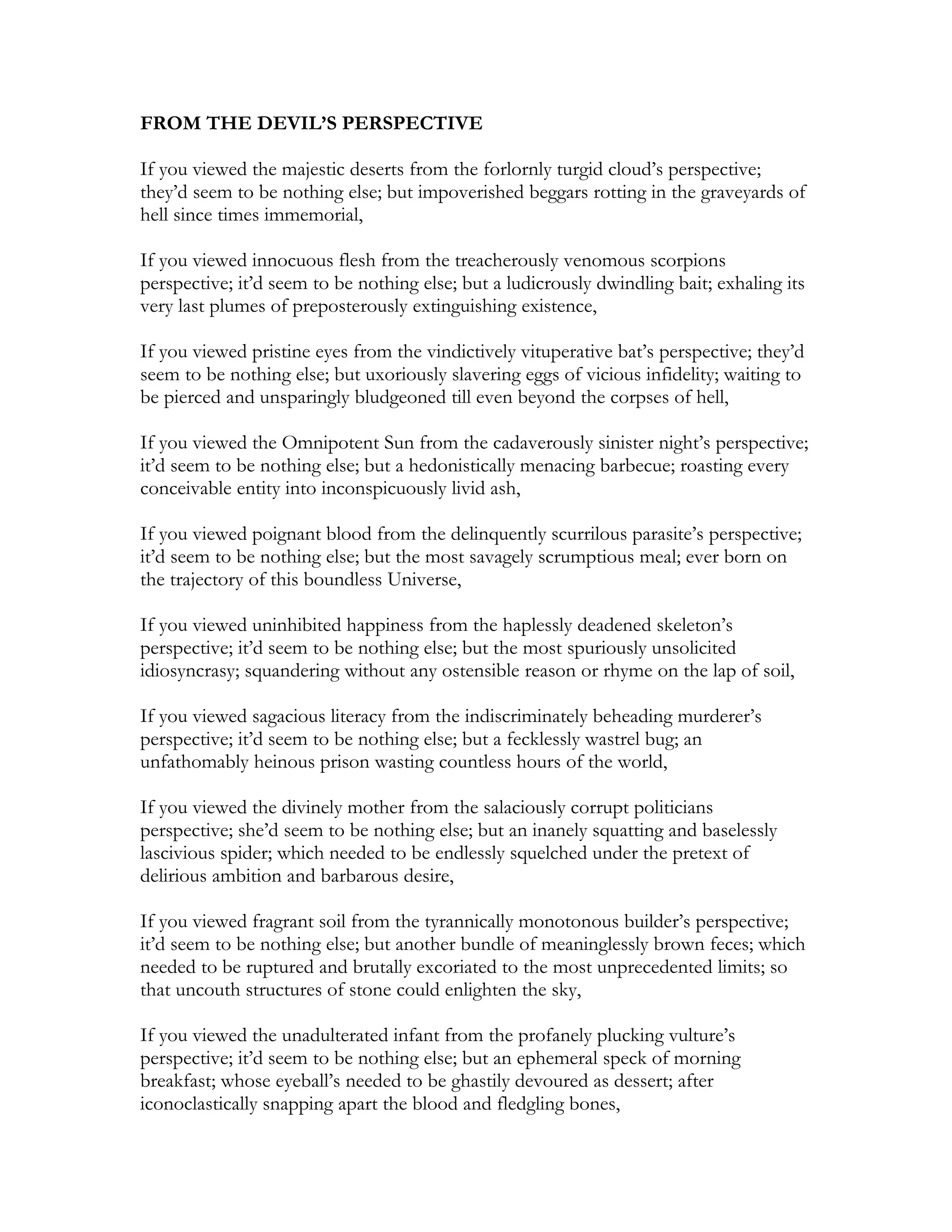 The document considers how various things may be viewed from different perspectives, particularly from perspectives that are negative or associated with evil (e.g. the devil). It states that from such perspectives, majestic deserts may seem like places for the poor to rot in hell, innocuous flesh may seem like bait for a venomous scorpion, and omnipotent sun may seem like a barbecue roasting all into ash. Overall, the document suggests that one's perspective can drastically alter how they view the world.