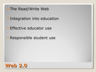 This document outlines a plan to introduce teachers at Archbishop John Carroll to new Web 2.0 tools for communication, organization, collaboration, and exploration in order to make learning more fun and effective. The project objectives are to select useful tools from a professional learning program, provide training to the entire faculty through in-service sessions and department meetings, and get teachers collaborating with each other while evaluating and expanding the use of these tools over time.
