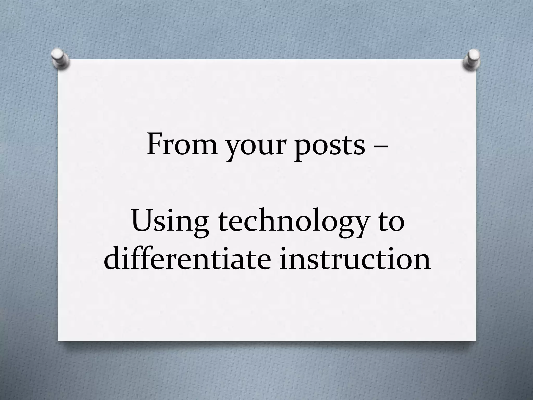 The document provides a list of over 20 links to online resources for differentiating instruction using technology. The links are organized into categories including resources for math, all subjects, articles about differentiation and technology, and videos about differentiation and technology. Some of the highlighted resources include TenMarks for math, IXL, EdPuzzle, Newsela, Kid Orange Tech, National Geographic Kids, and PBS Learning Media. The document aims to collect and share various online tools that teachers can utilize to differentiate lessons and meet the individual needs of students through technology integration.