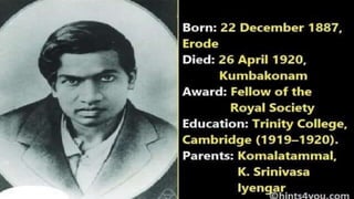Srinivasa Ramanujan was an Indian mathematician who showed great aptitude for mathematics from a very young age. As a child, he would solve complex math problems for other students. He developed his mathematical abilities largely through self-study and had discovered theorems and formulas not documented in books he obtained from the local college library. Ramanujan struggled to find recognition for his genius until he wrote a letter to mathematician G.H. Hardy at Cambridge University showcasing his abilities. Hardy arranged for Ramanujan to travel to Cambridge, where despite health issues, he made significant contributions to mathematical research and theories. Ramanujan received prestigious honors for his work but ultimately died young at age 32 from illness contracted in England