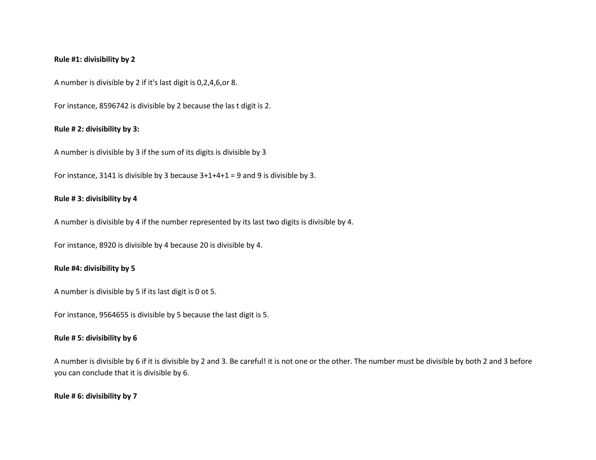 The document outlines 9 rules for determining divisibility by single digit numbers from 2 to 10. It states that a number is divisible by: