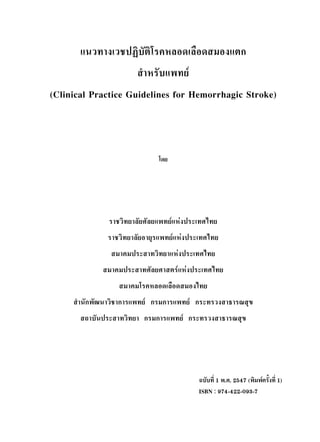 ”À√—∫·æ∑¬å (Clinical Practice Guidelines for Hemorrhagic Stroke) ‚¥¬ √“™«‘∑¬“≈—¬»—≈¬·æ∑¬å·Ààߪ√–‡∑»‰∑¬ √“™«‘∑¬“≈—¬Õ“¬ÿ√·æ∑¬å·Ààߪ√–‡∑»‰∑¬ ¡“§¡ª√– “∑«‘∑¬“·Ààߪ√–‡∑»‰∑¬ ¡“§¡ª√– “∑»—≈¬»“ µ√å·Ààߪ√–‡∑»‰∑¬ ¡“§¡‚√§À≈Õ¥‡≈◊Õ¥ ¡Õ߉∑¬ ”π—°æ—≤π“«‘™“°“√·æ∑¬å °√¡°“√·æ∑¬å °√–∑√«ß “∏“√≥ ÿ¢ ∂“∫—πª√– “∑«‘∑¬“ °√¡°“√·æ∑¬å °√–∑√«ß “∏“√≥ ÿ¢ ©∫—∫∑’Ë 1 æ.». 2547 (æ‘¡æå§√—Èß∑’Ë 1) † ISBN : 974-422-093-7