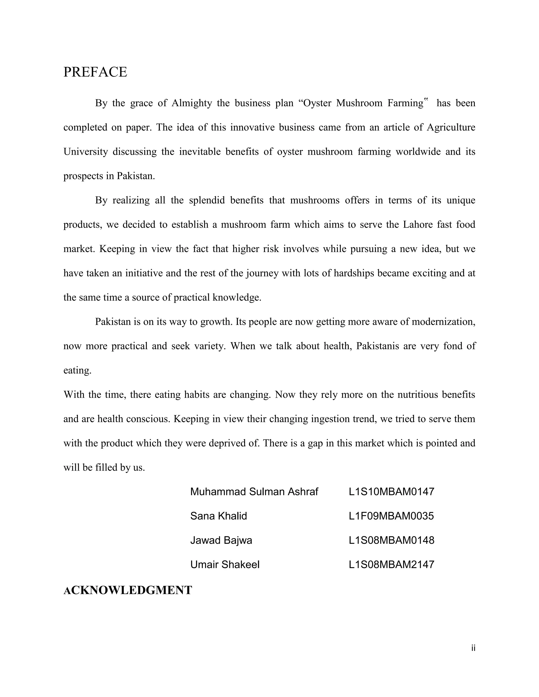This document outlines a business plan for an oyster mushroom farming operation in Lahore, Pakistan. The plan was motivated by research showing the health and economic benefits of mushroom farming. The business aims to serve the fast food market in Lahore by providing a nutritious product for health-conscious consumers. The plan was completed by four MBA students and received certification of supervision and originality.