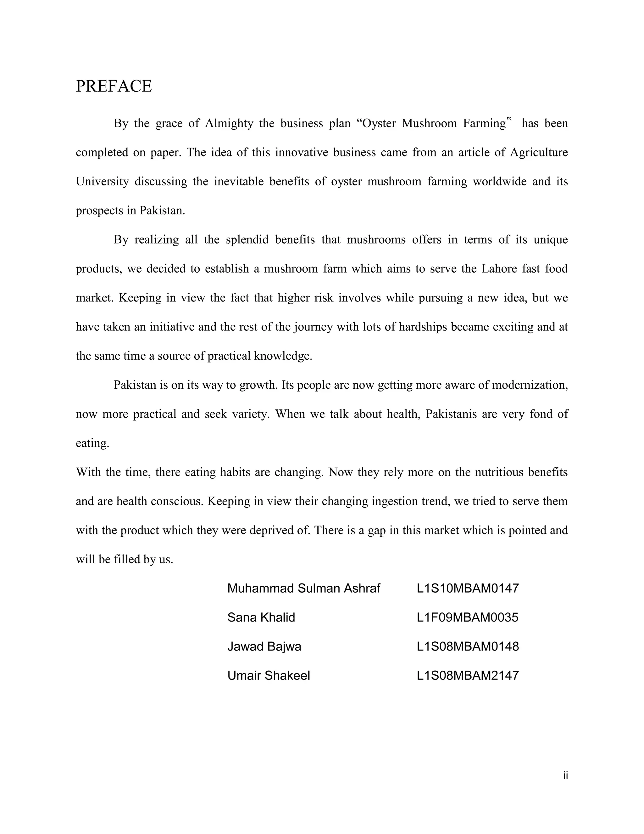 PREFACE<br />By the grace of Almighty the business plan “Oyster Mushroom Farming‟ has been completed on paper. The idea of this innovative business came from an article of Agriculture University discussing the inevitable benefits of oyster mushroom farming worldwide and its prospects in Pakistan.<br />By realizing all the splendid benefits that mushrooms offers in terms of its unique products, we decided to establish a mushroom farm which aims to serve the Lahore fast food market. Keeping in view the fact that higher risk involves while pursuing a new idea, but we have taken an initiative and the rest of the journey with lots of hardships became exciting and at the same time a source of practical knowledge.<br />Pakistan is on its way to growth. Its people are now getting more aware of modernization, now more practical and seek variety. When we talk about health, Pakistanis are very fond of eating.<br />With the time, there eating habits are changing. Now they rely more on the nutritious benefits and are health conscious. Keeping in view their changing ingestion trend, we tried to serve them with the product which they were deprived of. There is a gap in this market which is pointed and will be filled by us.<br />Muhammad Sulman AshrafL1S10MBAM0147<br />Sana KhalidL1F09MBAM0035<br />Jawad BajwaL1S08MBAM0148<br />Umair ShakeelL1S08MBAM2147<br />ACKNOWLEDGMENT<br />First of all, we are Thankful to Allah the Almighty for His guidance that He bestowed us with the power of knowledge and gave us strength and courage to complete this project.<br />We would like to thank Dr Muhammad Asif, for his motivational support in this project. He was always there to listen and to confer information. He showed us different way to approach research problems. Finally he gave us opportunity to provide services at his laboratory because of our knowledge and proficiency that we gained from the project.<br />We would also like to express our heartiest gratitude to our supervisor Prof Farooq Hussain and Prof. Fahdia Khalid. They are very kind and humble. Their supervision and suggestions were always supportive.<br />Special thanks go to our parents; they are responsible for completing this dissertation as well as the whole educational career that lies behind it. Last but surely not least, we want to acknowledge wonderful cooperative peoples: Mr. Asim from Pizza Hut, Shehzad Aziz from Okara Feeds, Ahmed Khan from Fine Pizza, and Mr. Ali Aslam from A&T Company Karachi.<br />Muhammad Sulman AshrafL1S10MBAM0147<br />Sana KhalidL1F09MBAM0035<br />Jawad BajwaL1S08MBAM0148<br />Umair ShakeelL1S08MBAM2147<br />CERTIFICATE OF SUPERVISION<br />It is to certify that business plan titled as “Oyster Mushroom Farming” has been completed by Muhammad Sulman Ashraf, Sana Khalid, Jawwad Bajwa, and Umair Shakeel  under my supervision in order to fulfill the requirement of their Masters of Business Administration studies program.<br />Project Supervisor<br />________________<br />Project Advisor<br />________________<br />CERTIFICATE OF ORIGINALITY<br />This project is submitted in partial fulfillment of the requirements for the MBA program. We, the undersigned, declare that this project report is our own original work. Where we have taken ideas and or wording from another source, this is explicitly referenced in the text.<br />Muhammad Sulman Ashraf<br />______________________<br />Sana Khalid<br />______________________<br />Jawwad Bajwa<br />______________________<br />Umair Shakel<br />______________________<br />