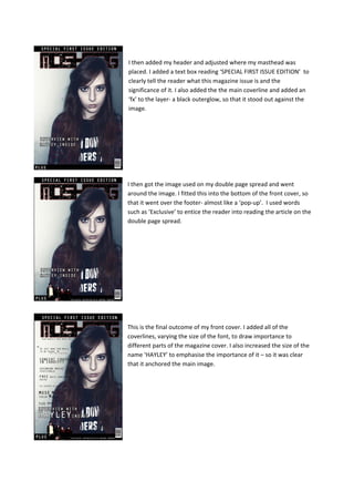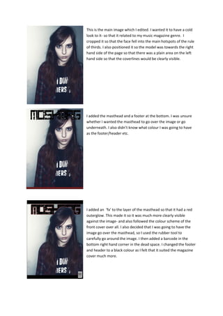 The document describes the process of designing a magazine cover. The designer edited the main image to give it a cold look suitable for a music magazine. Text elements like the masthead, coverlines, and footer were added and their design and placement were adjusted. These included changing colors, adding effects like outer glows, and positioning some text over or under the main image. The final cover emphasizes the main image and coverlines to draw the reader in and communicate what is inside the special issue.