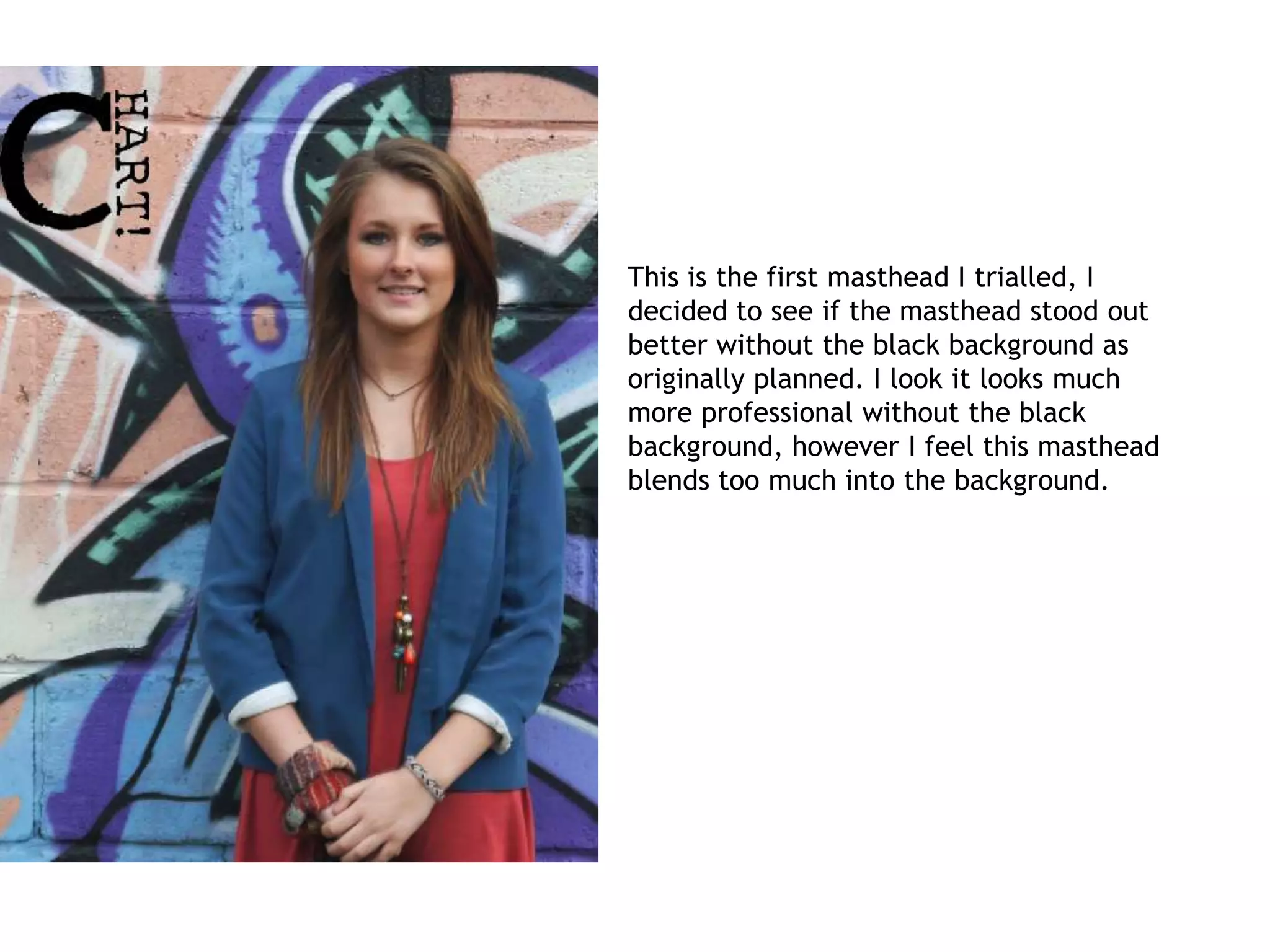 This document discusses different trial masthead designs for a magazine. It provides feedback on various designs testing color combinations, layouts, and design elements. The best design used black and white contrast with rearranged letters and a thick black border that was eye-catching while maintaining a professional style. Minor tweaks like adding more white outlines or thickening borders were suggested to improve the leading design choice further.