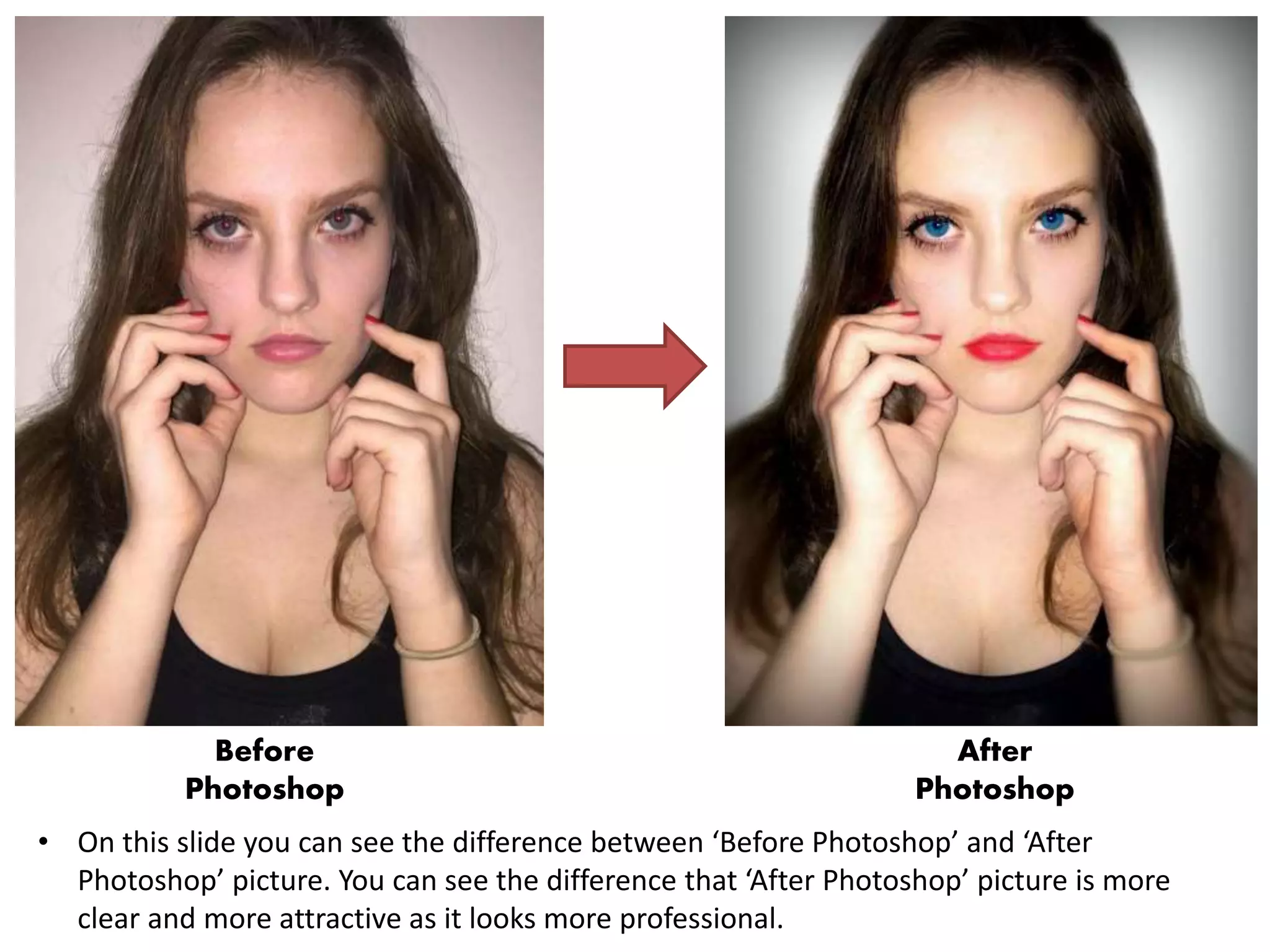 Photoshop can be used to enhance images, making them clearer and more attractive. An example image is shown before and after being edited in Photoshop, with the after version looking more professionally processed and appealing. Photoshop allows users to improve image quality and make pictures look more polished and attractive.