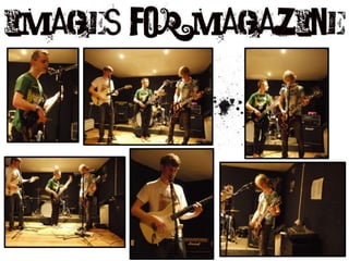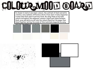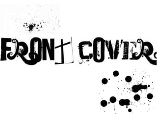 The document discusses the design process for the front cover of a magazine. It describes choosing a black, white and grey color scheme to create contrast. Bold fonts and a "paint splatter" masthead were selected to draw attention. Various puffs and images were tested before choosing a photo of a musician facing the camera to portray the cover story. The final design includes this large central image, puffs arranged horizontally and vertically, and date/price information set apart in white.