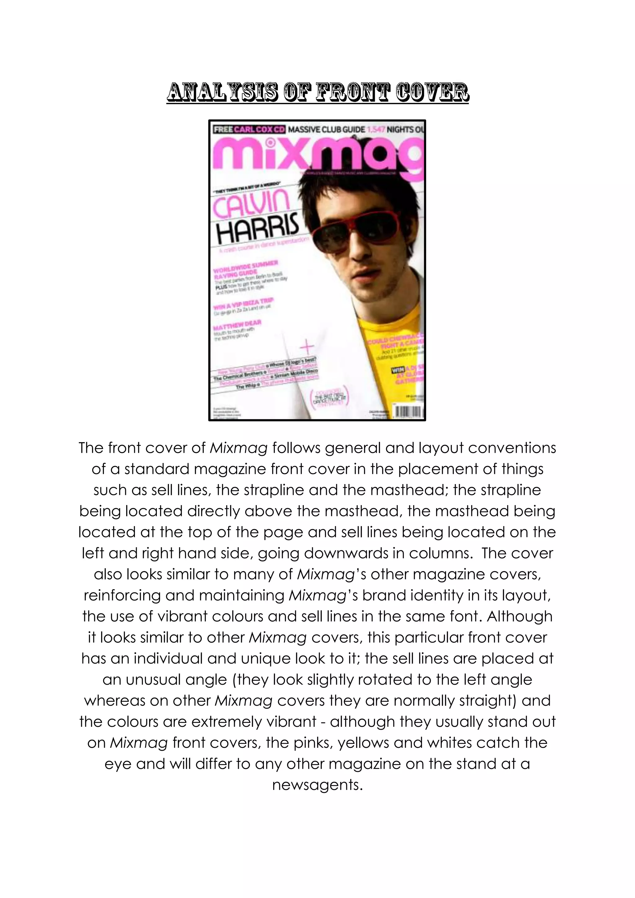 The front cover of Mixmag magazine follows conventions of magazine design through placement of elements like the masthead, sell lines, and date. This cover features Calvin Harris and uses vibrant colors and his cool image to appeal to the target audience of young males interested in dance music. The layout and design elements like fonts, placement of text, and color scheme maintain Mixmag's brand identity while drawing in readers through an exciting cover image and enticing sell lines written in a casual style.