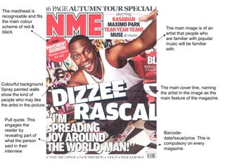 The document analyzes the front covers of three music magazines: NME, Kerrang!, and Big Cheese.