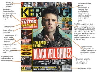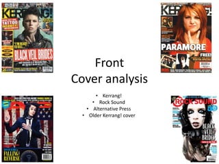 This document analyzes magazine covers from Kerrang!, Rock Sound, and Alternative Press magazines. It discusses various design elements of the covers including images, layouts, fonts, and color schemes. The target audience for these magazines is identified as teenagers and young adults aged 15-21 interested in rock and alternative music genres. Specific bands and artists featured on the covers are examined in terms of attracting readers and representing the styles of music covered in each magazine.