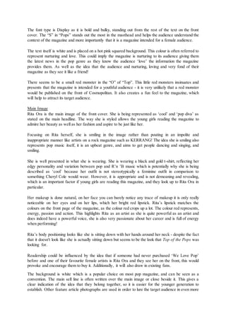 This document analyzes the front cover layout of the magazine "Top of the Pops". It discusses several elements of the cover including the masthead, main image, sell lines, fonts, and layout. The masthead uses stars and bold fonts to represent the magazine's focus on pop stars. The main image of Rita Ora presents her as cool and stylish to inspire young readers. The sell lines use informal language and focus on gossip about celebrities to attract teenage girls. Overall, the cover aims to appeal to its target audience through bright colors, multiple images, and gossip about popular artists.