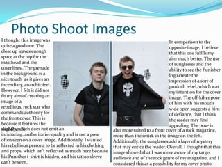 The document discusses different drafts and iterations of a magazine cover design. It begins by presenting two initial photo options and selecting one to move forward with. Several first draft designs are then shown and feedback provided, noting to use red instead of blue as the dominant color. The final draft incorporates this feedback, making the masthead more prominent, adding more cover lines for a busier look, and changing the font to better match the style. The conclusion reflects on how the final design better achieves an intimidating and rebellious feel in line with the target audience.