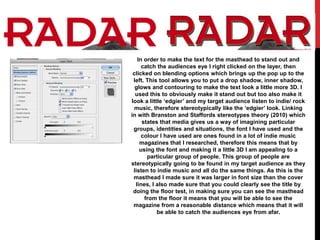 1) Using blending options to add a drop shadow and glow to the masthead text to make it stand out and appeal to the target indie/rock music audience.