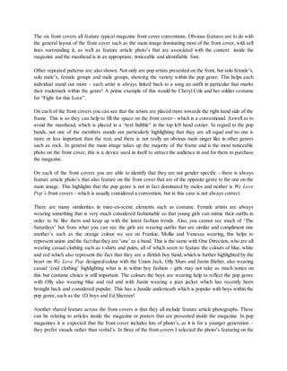 This document analyzes six front covers of the pop music magazine "We Love Pop" to identify shared features and patterns. It finds that the covers consistently feature: the artist prominently on the right side; additional feature photos of both male and female artists; bright colors associated with pop music. Costume choices aim to keep young readers up-to-date on fashion trends. The signature masthead, pug logo, and use of photos also remain consistent across issues. These repetitive elements help maintain the magazine's brand identity and attract its target audience.