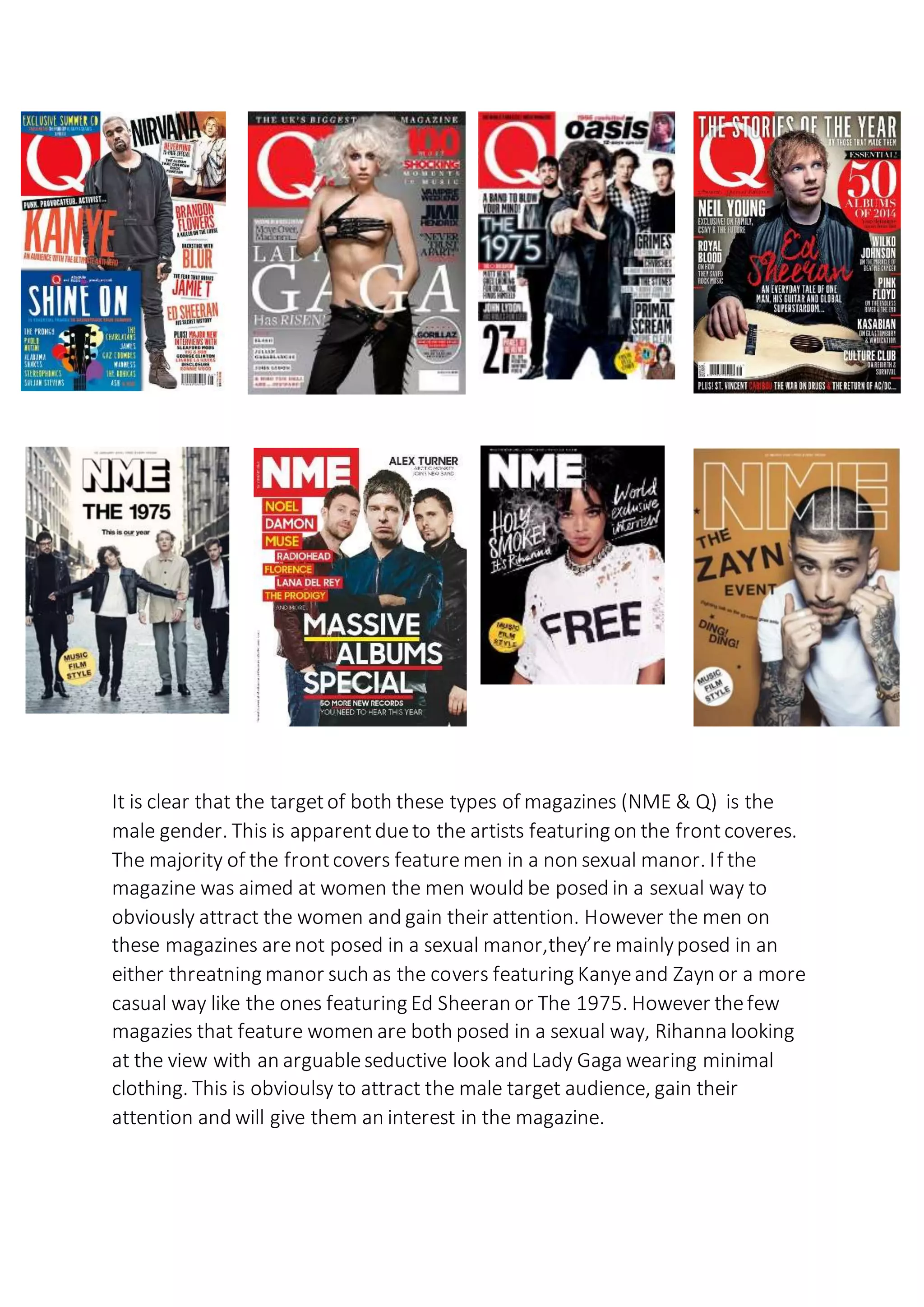 This document analyzes and compares the front covers of music magazines NME and Q. It finds that both magazines target younger male audiences, as evidenced by the predominantly male artists featured on covers posed in a non-sexual manner. While some women are posed sexually, suggesting an intention to attract male readers. The lifestyles promoted involve indie rock themes like drug use. Over time, NME has simplified its covers to appeal more to male tastes. Both magazines feature some non-indie artists to broaden their audiences and sales.