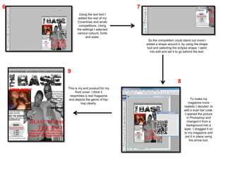 1. The document describes the steps taken to create a magazine cover in Photoshop, including adding text, images, and design elements like shapes and scan barcodes.